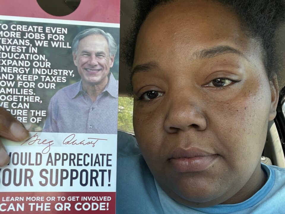 Monique Dawson, a former canvasser for Governor Greg Abbott’s election campaign, says she was fired after she was recorded laughing with a resident who said they would “absolutely not” be voting for the Texas Republican in the upcoming election.