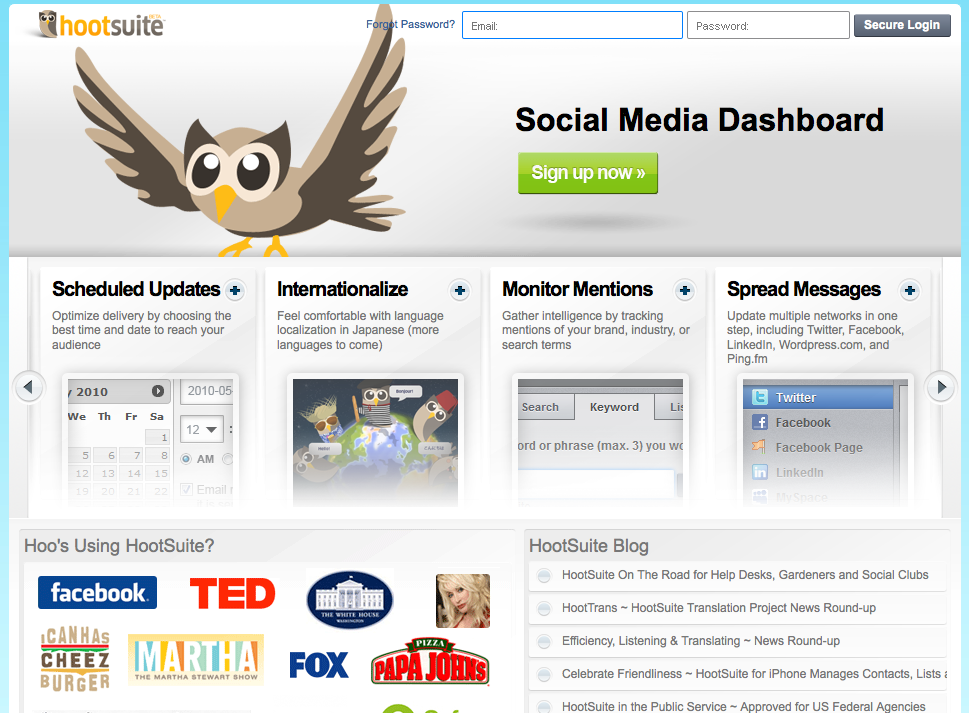 HootSuite — Schedule updates to Twitter, Facebook, LinkedIn, WordPress and other social networks with HootSuite web, desktop, or mobile apps. For a business, when it comes to measuring results, HootSuite can make that easier by allowing users to track campaign results and industry trends. Posting Twitvids, Twitpics, and links is made easier with a drag and drop function. Links can also be shortened in the same window.