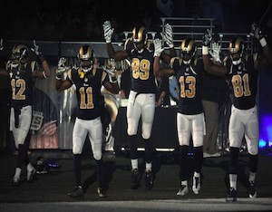 Five united St. Louis Rams football players stood against racism and injustice as they took the field in what has become a controversial pre-game introduction. Tavon Austin (#11), Kenny Britt (#81), Stedman Bailey (#12), Jared Cook (#89) and Chris Givens (#13) —all African American— came out to the Edward Jones Dome with their arms raised.
