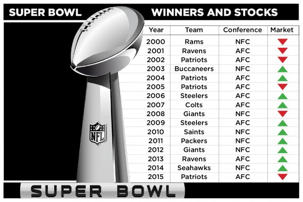 Here’s how it works: If a National Football Conference Team (NFC) wins, it’s an up year for stocks.  If an American Football Conference Team (AFC) wins, it’s a down year.