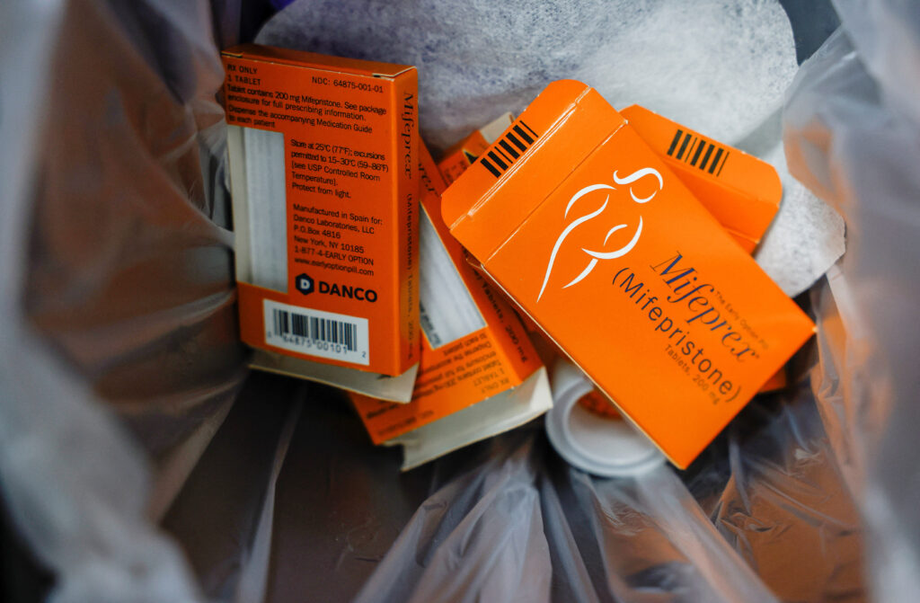 Used boxes of Mifepristone, the first pill in a medical abortion, line a trash can at Alamo Women’s Clinic in Carbondale, Illinois, U.S., April 20, 2023. REUTERS/Evelyn Hockstein