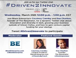 On Wednesday, March 25, from noon to 1:00 p.m. EST, Black Enterprise is holding a Twitter chat with Content Producer Courtney Connley on innovation and diversity in technology, growing your business outside of Silicon Valley, how to gain venture capital funding for your startup and more, featuring Don Charlton, founder and CEO of The Resumator, a software company that recruits top talent.