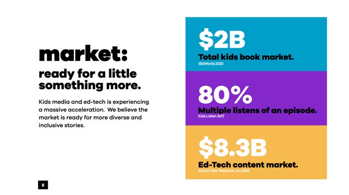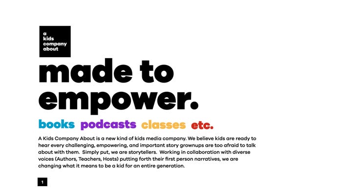 The book tackles tough topics such as racism, White privilege, mental health, sexual assault, and gender. The book is designed for parents and their children to read them together. The Kids Company is described as a new kind of children’s media company in the pitch deck to investors. One that believes kids are ready to hear every challenging, empowering, and important story adults are too afraid to discuss with children.