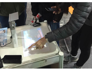 The Lazertouch emits an invisible laser beam parallel to the projected screen. Lazertouch creates a virtual touchscreen and interactive whiteboard which can be sued for meetings, presentations, showing 3-D movies (it supports 200-inch HD movies), gaming, virtual reality, and more.