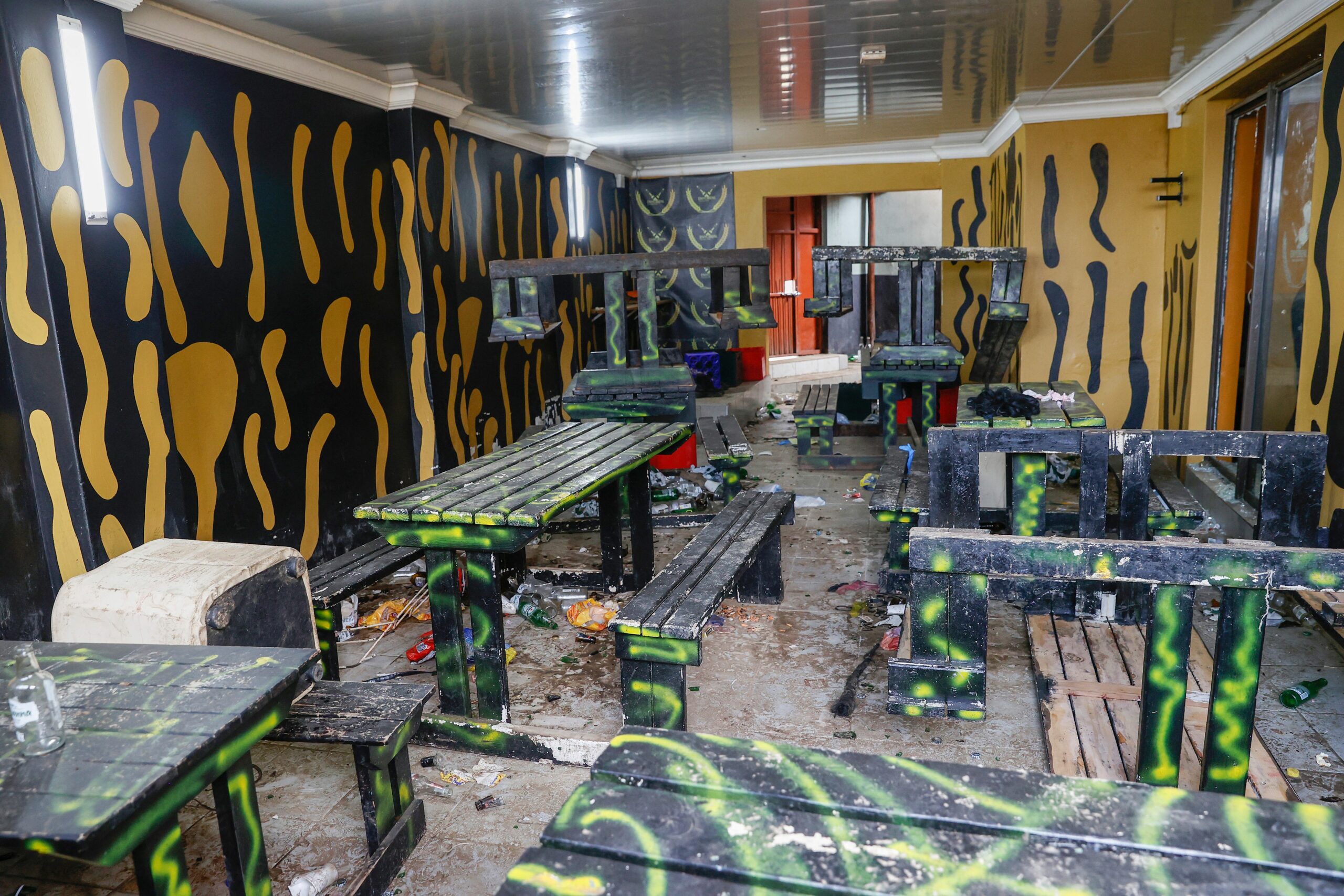 Empty alcohol bottles, wooden chairs, and tables are seen inside a township pub in southern city of East London in South Africa on July 5, 2022, after the death of 21 teenagers in the establishment. Survivors described a battle to escape the jam-packed premises and one reported a suffocating smell.  (Photo by Phill Magakoe/AFP via Getty Images)