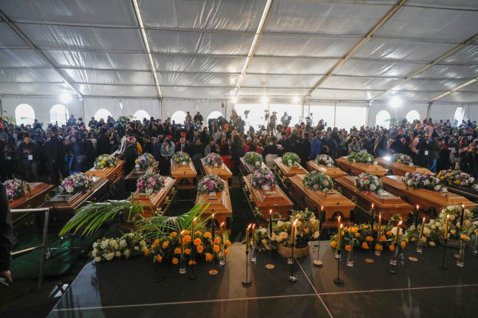 Empty coffins used in a symbolic mass memorial service in East London, South Africa on July 6 after 21 teens died in unclear circumstances at a township tavern last month. (Photo by Phil Magakoe/ AFP via Getty Images)