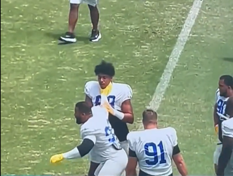 Los Angeles Rams Super Bowl-winning defensive tackle Aaron Donald is seen on video grabbing the throat of his rookie teammate Elijah Garcia during a recent preseason team practice. We don’t have the benefit of audio or understanding of what is going on. Donald may be demonstrating some practice drill that the rookie can utilize during a game.