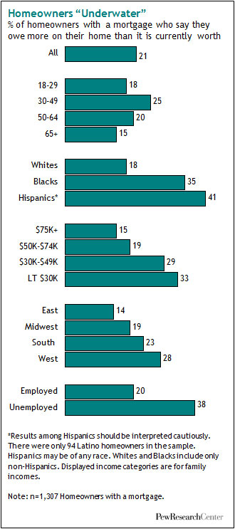As just about every real estate enthusiast knows by now, a homeowner is considered to be underwater if they are paying off a mortgage that is more than the current value of their home. In banking circles the phenomenon is ominously known as “negative equity.†According to a new survey conducted by the Pew Research Center, some 35% of African American homeowners in the U.S. are currently underwater, compared to 41% of Hispanics, and 18% of whites.
