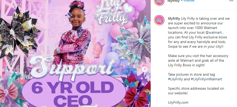 Anything is possible in business, even at the age of six. Just ask Lily Adeleye, CEO (Cutest Executive Officer) of Lily Frilly. According to a statement, the little girl from Florida landed a sizable deal to sell new and exclusive hair bow designs–including the Gold & Glitter Hair Bow, Galaxy Girl Hair Bow, Safari Party Hair Bow and the Candy Rush Hair Bow—with Walmart. The item launch will be in 1,102 Walmart stores and on Walmart.com this month.